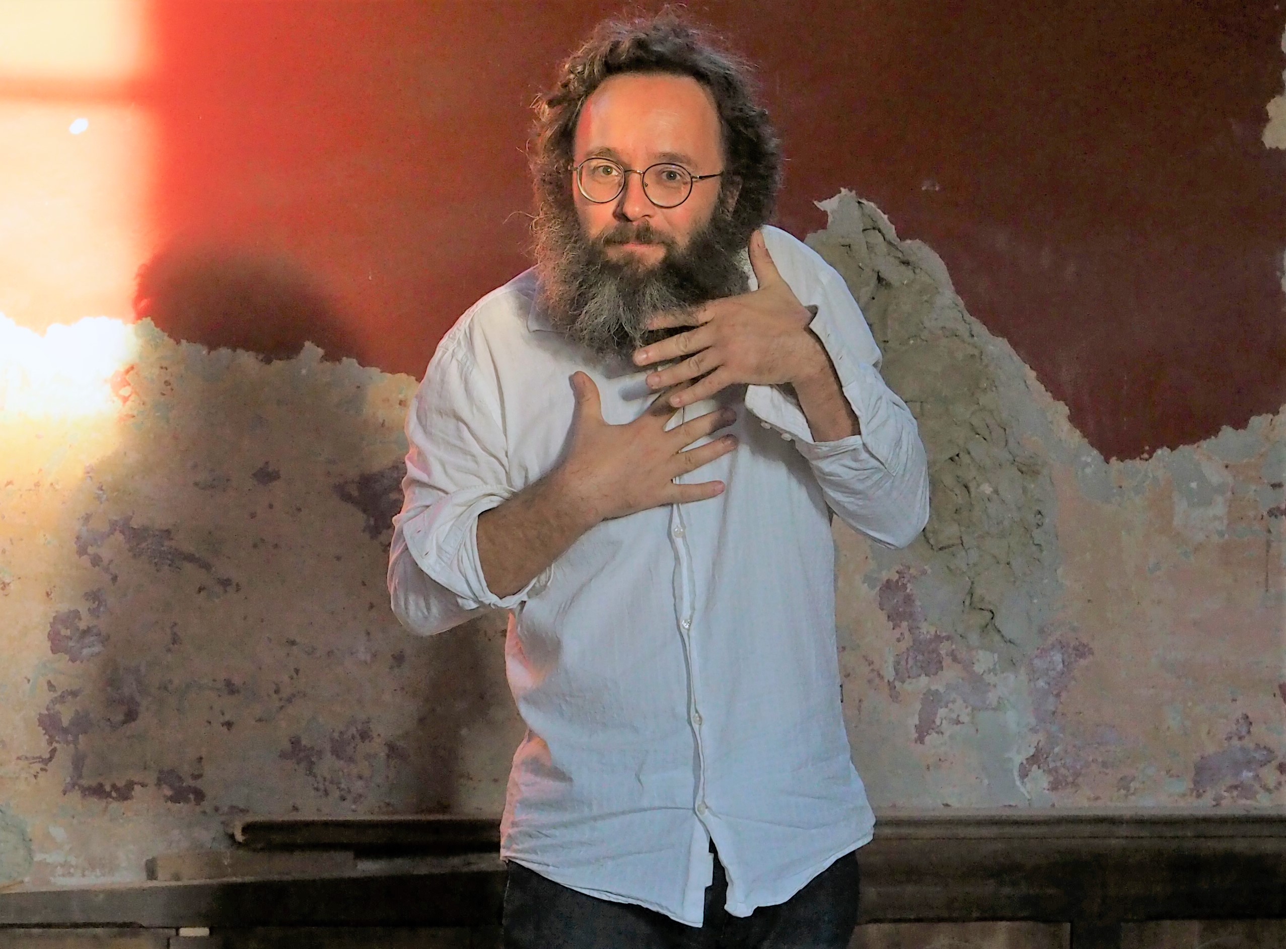Le spectacle se donne en plein air ou en salle, dans le nouveau dispositif artistique de la compagnie — pauvre, épuré : le comédien joue tout simplement dans un carré formé au sol par seize bâtons.